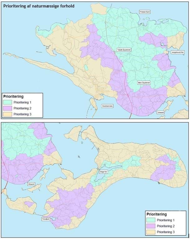 Der er lavet en prioritering af naturmæssige forhold i tre niveauer i de forskellige oplande til vandløb og søer.