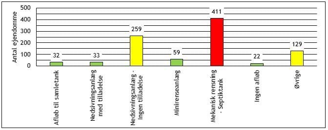 Afløbsforholdene på ejendommene er fastlagt ud fra udtræk fra BBR (Bygnings- og Boligregisteret) i 2020.
