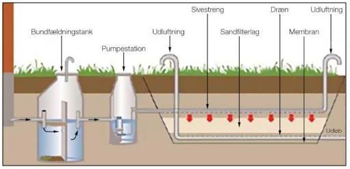 Sandfiltre er i princippet opbygget som nedsivningsanlæg, hvor vandet renses ved at sive gennem et tykt lag sand med membran i bunden for opsamling af spildevandet i drænsystem. Det opsamlede vand ledes til recipienten. Biologiske sandfilteranlæg kan kun anvendes i oplande, hvor der ikke stilles krav til fosforfjernelse.