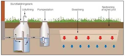 Et nedsivningsanlæg fungerer ved at lade forrenset spildevand sive gennem et fordelerlag og ned i jorden.Nedsivningsanlæg kan etableres i områder, hvor nedsivning kan ske uden risiko for forurening af vandboringer og grundvandet. Se endvidere kapitel 4.10 ”Administration - Administrationsforhold ved nedsivning”.Der er afstandskrav fra et nedsivningsanlæg til drikkevandsboringer og -brønde på 300 meter og 150 meter til markvandingsboringer. Efter konkret vurdering kan der dog dispenseres.Endelig skal jordbundsforholdene være egnet til nedsivning, og der er minimumskrav om afstanden til grundvandet. Disse forhold skal undersøges i hvert enkelt tilfælde.